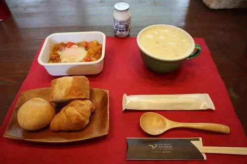 今回の食事は2泊ともほぼ持ち込みで済ませたけど、宿ブロガーとしては朝食も経験しておきたいと思ったので1泊目は朝食を付けました。 朝食の時間は8時から9時半までの30分刻みで、指定した時間にスタッフさんが玄関まで届けてくれます。 こんな感じでバスケ…