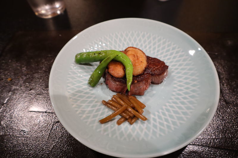 強肴 和牛ヒレ肉のグリル 自家製ポン酢 万願寺唐辛子 原木椎茸 山葵三杯酢